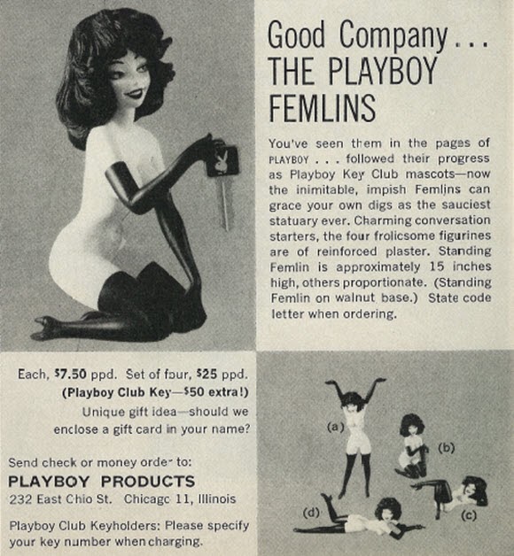 This is probably the most unique and valuable item that Playboy ever sold. The Femlins were cartooned figures created by LeRoy Neiman in 1955 when Hugh Hefner wanted the Party Jokes section of the magazine to be adorned with an amusing creative element. Their name is a cross between "female" and "gremlin" and they also apparently prefer to cover up every part of their body except for the private ones! In the early 1960s these naughty figurines would set you back only $25, but today they are worth a LOT of smackers--a seller I found online was asking between $6,000 and $9,000 for his full set. A seller on eBay is asking nearly $2,000 for just one. Throughout the years, the femlins have adorned mugs, candles, books, shotglasses and playing cards, and still appear in the magazine.