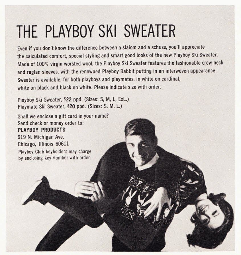 I can appreciate that these sweaters were made of 100% virgin worsted wool (the only thing that's a virgin in the photo) because by the 80s, so many sweaters were being made of acrylic, a cheap substitute for the real thing. It's interesting that Playboy Club keyholders could simply charge to their accounts by giving the key number with their order.