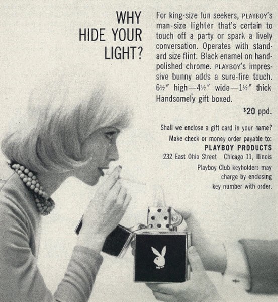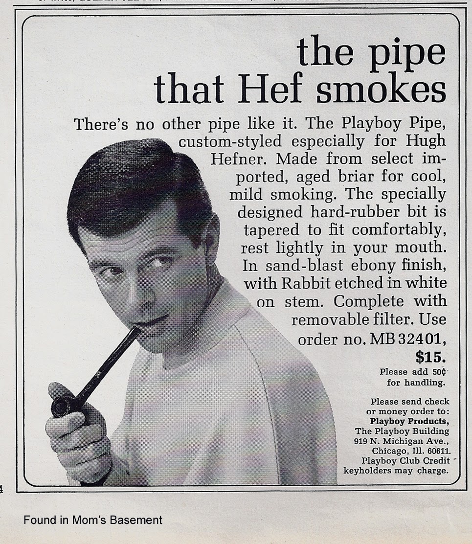 Well, this is one item that hasn't make a comeback, at least not yet. I published a post a few years ago on the popularity of pipe smoking in the 50s and 60s and while I'm not a fan of smoking, I must admit that pipes as a wardrobe element are kind of cool (my father smoked one, so maybe that has something to do with it.) By the time this ad was published, pipe customers were no longer limited to grandfathers in rocking chairs; the average American male was shown in many ads featuring unrelated products, perhaps to enhance the masculinity. Since Hefner loved his pipes during this time, it only makes sense that Playboy would issue its own.